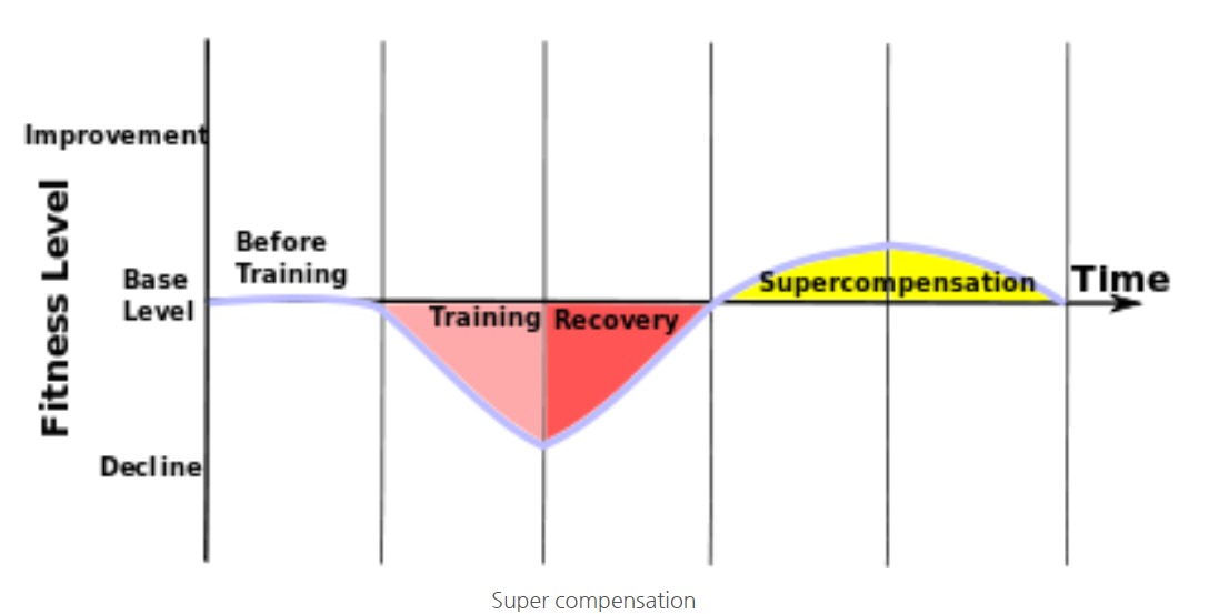 여기에서 초과회복(Super compensation)이란 운동 후 회복이 진행될때에 영양을 보충하고 휴식을 취하면 근육의 기능이 원래의 수준 이상으로 향상되어 이후에 부하가 주어졌을때 다시 손상되지 않게 되고 기능이 발달하는데 이것을 초고 회복이라고 합니다.운동 및 헬스로 근육을 성장시키기 위해서 디로딩 하는 것은 필수라는 것입니다.